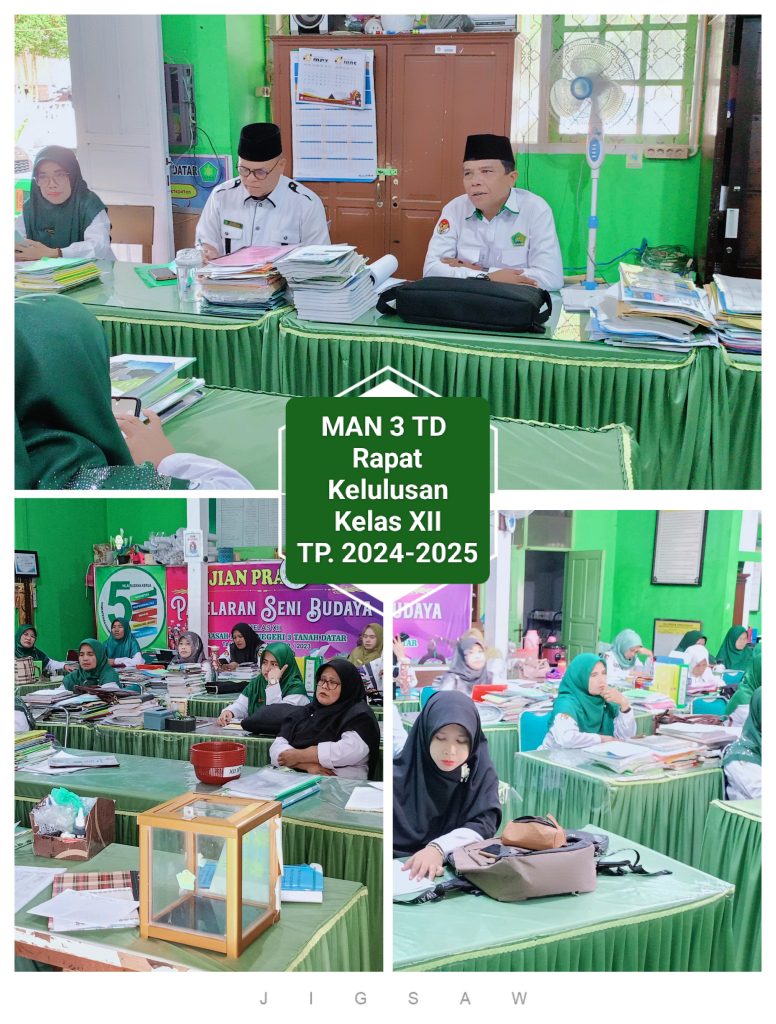 Hari ini Senin 5 mei 2025 MAN 3 TD rapat kelulusan kelas XII yang dipimpin langsung oleh kepala madrasah Yarman, MA. Adapun syarat-syarat kelulusan merujuk kepada KTSP yang telah ditetapkan seperti, :Memiliki nilai rapor lengkap, smt 1-6,memiliki nilai ujian akhir dan praktek,lulus AM minimal batas KKM, kepribadian bernilai baik,kehadiran minimal 85% , Alhamdulillah semua syarat diatas dapat terpenuhi oleh peserta didik kelas XII, kecuali ada satu orang siswa yang tidak lulus karena tidak mengikuti pbm selama 2 bulan dan tidak pula mengikuti Asesmen akhir madrasah.