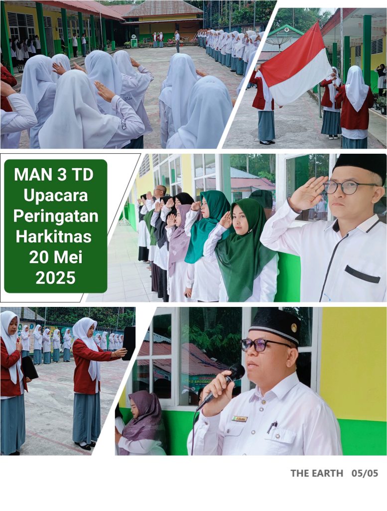 Man 3 TD ikut andil memperingati hari kebangkitan nasional dalam bentuk melaksanakan upacara bendera. Yarman MA selaku kepala madrasah mengamanahkan kepada wakasis Nurkamal, S.Ag untuk bertindak sebagai pembina upacara. Diantara isi amanat yang disampaikan jadikan peringatan kebangkitan nasional sebagai momentum untuk lebih giat lagi memajukan madrasah secara bersama sesuai dengan tupoksi masing-masing yang saling berkolaborisasi antara satu dengan yang lain. Disisi lain Nurkamal juga menyampaikan motivasi untuk siswa dengan kata ” ayoo bangkit” dari yang tidak baik menjadi baik, dari malas menjadi rajin, dari sungguh-sungguh menjadi lebih sungguh – sungguh, ayoo kerja keras raih masa depan yang lebih cemerlang. Humas…(Sw)